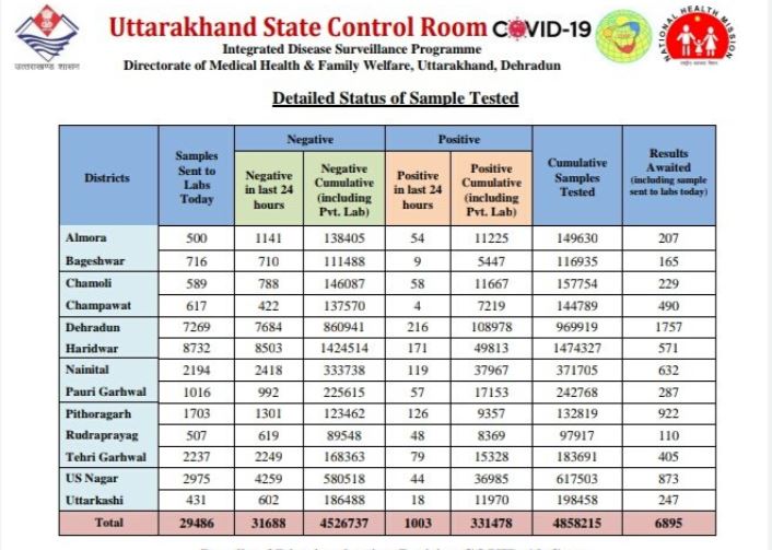 बुधवार को सामने आए 1003 नए मामलों में अल्मोड़ा में 54, बागेश्वर में 09, चमोली में 58, चंपावत में 04, देहरादून में 216, हरिद्वार में 171, नैनीताल में 119, पौड़ी में 57, पिथौरागढ़ में 126, रुद्रप्रयाग में 48, टिहरी में 79, ऊधमसिंह नगर में 44 और उत्तरकाशी में 18 नए कोरोना के मामले सामने आएं हैं।