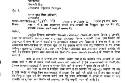 कक्षा-1 से 8 तक निःशुल्क जूता एवं बैग धनराशि उपलब्ध कराये जाने के सम्बन्ध में नया आदेश हुआ जारी