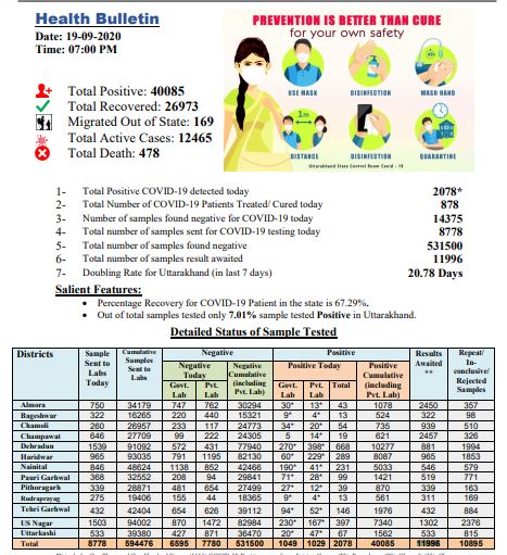 उत्तराखंड में कोरोना बेकाबू होता दिख रहा है। आज प्रदेश में कोरोना के रिकॉर्ड 2078 नए केस मिले हैं। इसके साथ ही प्रदेश में कुल मामलों की संख्या तेजी से 40 हजार का आंकड़ा पार करते हुए 40085 तक पहुँच गया है।