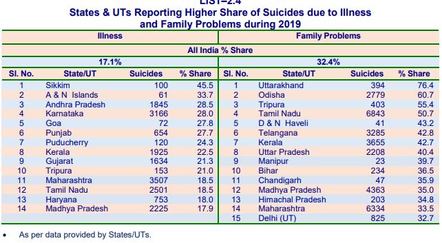 NCRB के आंकड़ों से पता चलता है कि उत्तराखंड में परिवार से जुड़े मुद्दों के कारण आत्महत्याओं का कुल 76 प्रतिशत है जोकि अन्य सभी राज्यों में सबसे अधिक है।