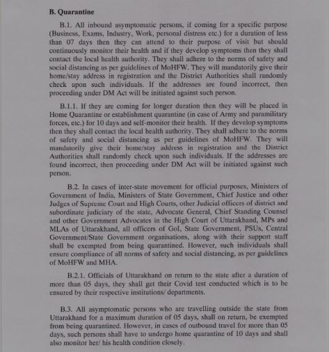 इसके साथ-साथ प्रदेश सरकार ने क्वारंटीन के नियमों में भी कुछ रियायत दी गई है। सात दिन से कम समय के लिए किसी जरूरी कार्य के लिए आने वाले व्यक्ति को क्वारंटीन की जरूरत नहीं। सात दिन से अधिक समय के लिए आने पर 10 दिन सेल्फ क्वारंटीन रहना होगा। इसके अलावा राज्य में केंद्र व राज्य सरकार के मंत्रियों, न्यायाधीशों को क्वारंटीन होने से छूट दी गई है लेकिन इस दौरान उन्हें सोशल डिस्टेंसिंग का पालन करना होगा। राज्य में आने वाला हर व्यक्ति जिसके पास चार दिन की कोविड निगेटिव रिपोर्ट है, उन्हें होम क्वारंटीन नहीं होना होगा।