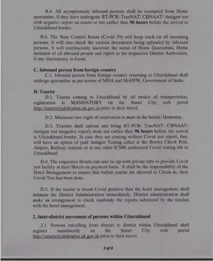 मुख्य सचिव ओमप्रकाश द्वारा जारी आदेश के अनुसार, उत्तराखंड आने वाले पर्यटकों के पास कोविड टेस्ट रिपोर्ट नहीं है तो बार्डर चेक पोस्ट, एयरपोर्ट, रेलवे स्टेशन आदि स्थानों पर पेड एंटीजन टेस्ट करवा सकता है। राज्य में प्रवेश करने वालों के थर्मल टेस्ट की व्यवस्था संबंधित जिला प्रशासन करेगा। अगर किसी व्यक्ति में कोरोना के लक्षण पाए जाते हैं तो उसका एंटीजन टेस्ट किया जाएगा।