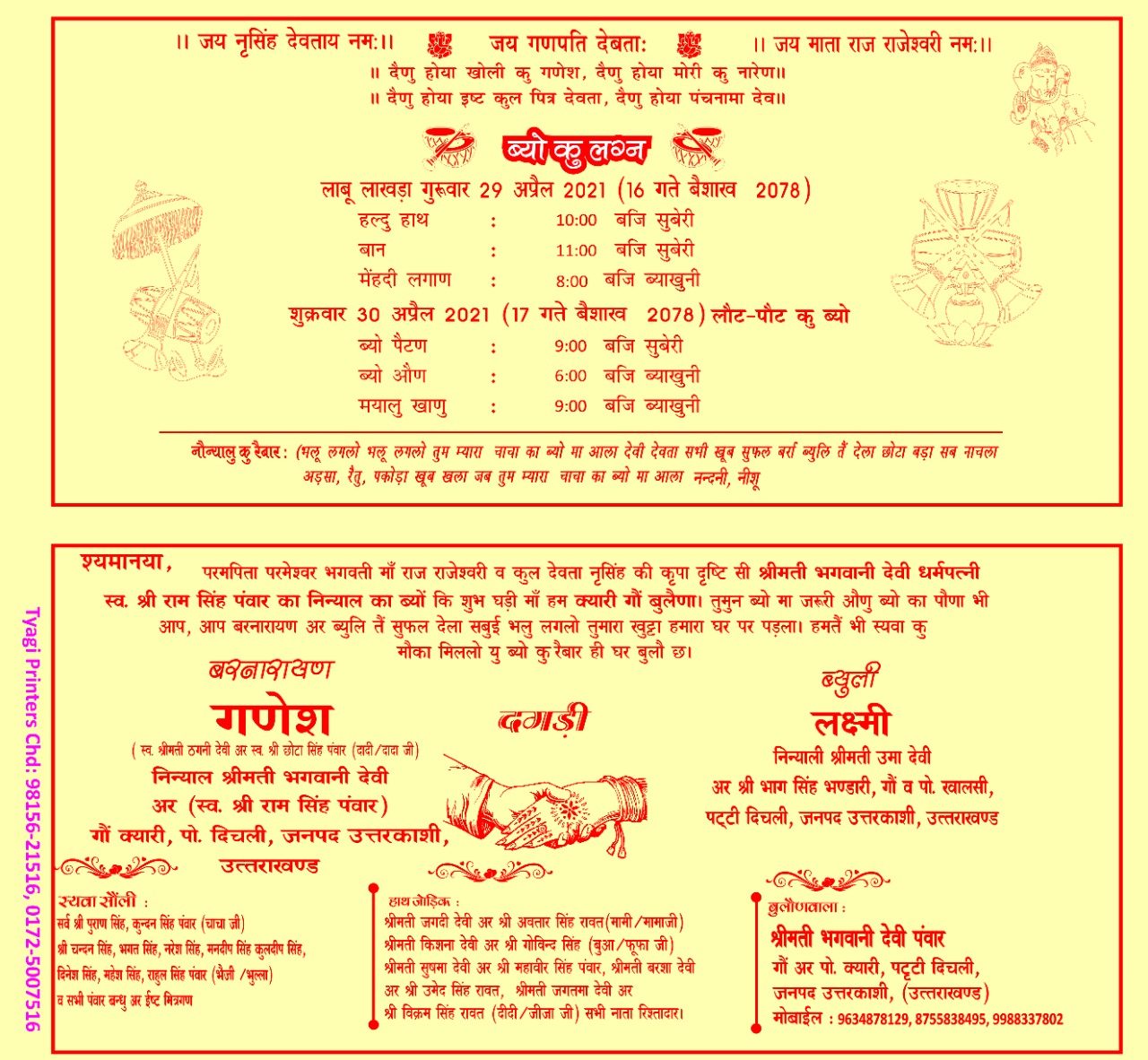 दरअसल, सोशल मीडिया में एक शादी का कार्ड वायरल हो रहा है जो कि पूरी तरह से गढ़वाली बोली में छपवाया गया है, जो सोशल मीडिया पर खूब प्रशंसा बटोर रहा है। इस सराहनीय पहल के पीछे हाथ है उत्तरकाशी के क्यारी गांव के गणेश पंवार जी का। गणेश की शादी अप्रैल में है और उन्होंने अपनी शादी का कार्ड शुद्ध गढ़वाली बोली में छपवाया है।