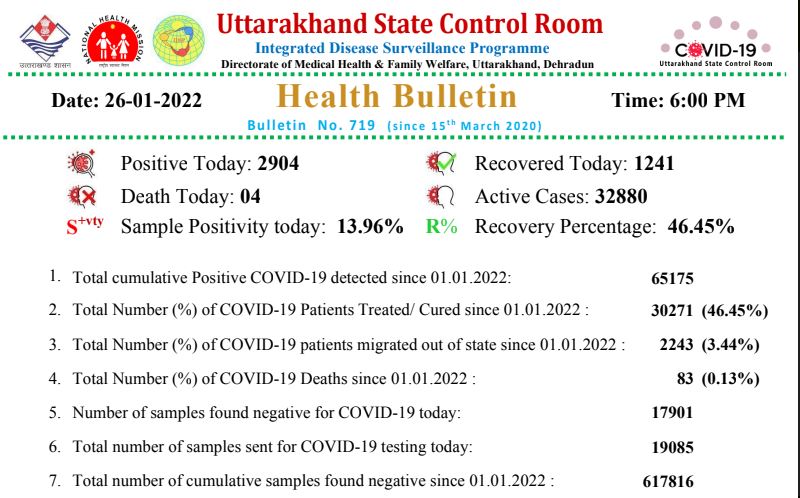 उत्तराखंड में कुल एक्टिव संक्रमितों की संख्या 32880 है। आज 1241 मरीज स्वस्थ होकर घरों को लौटे इस तरह इस साल अब तक कुल मिलाकर 30271 लोग स्वस्थ होकर घर को लौट चुके हैं इस तरह कुल मामलों में रिकवरी रेट 46.45 फीसदी है। कोरोना के नए मामलों में 2223 लोगों को इलाज के लिए राज्य से बाहर के अस्पतालों में माइग्रेट भी किया गया है। आज 2904 की रिपोर्ट पॉजिटिव आई जबकि 17901 रिपोर्ट नेगेटिव पायी गई इस तरह आज का पॉजिटिविटी रेट 13.96 फीसदी रहा, राज्य में अभी 19085 सैंपल की रिपोर्ट आनी बाकी है। 1 जनवरी 2022 से लेकर अब तक 617816 टेस्ट रिपोर्ट नेगेटिव आ चुकी है।