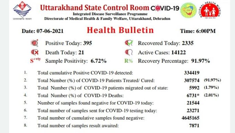 उत्तराखंड में कोरोना के 395 नए केस सामने आए हैं। 2335 मरीज ठीक हुए और 21 मरीजों की मौत हुई है इसके साथ ही प्रदेश में कुल संक्रमित मरीजों की संख्या 334419 हो गई है। कुल ठीक होने वाले मरीजों की संख्या 307574 है जबकि 14122 एक्टिव केस हैं। प्रदेश में कुल 6731 मरीजों की कोरोना से मौत हुई है।