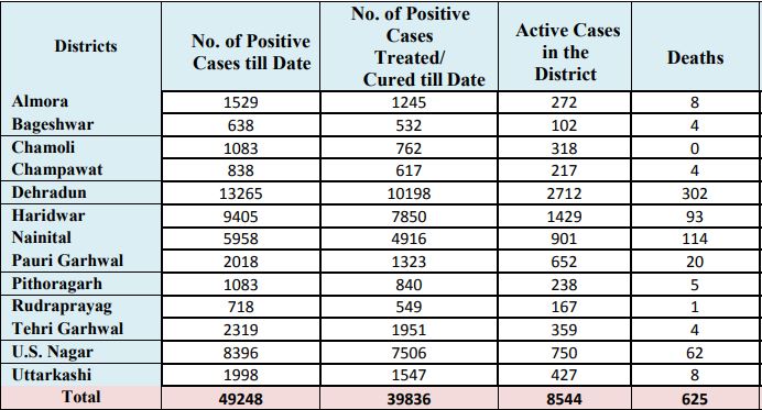 उत्तराखंड में कुल कोरोना मरीजों की संख्या 49248 पहुँच गई है। इसमें से 39836 मरीज ठीक हो चुके हैं। एक्टिव केस की संख्या 8544 है जबकि 625 मरीजों की मृत्यु हो चुकी है। 243 मरीजों को इलाज के लिए राज्य से बाहर भेजा गया है।