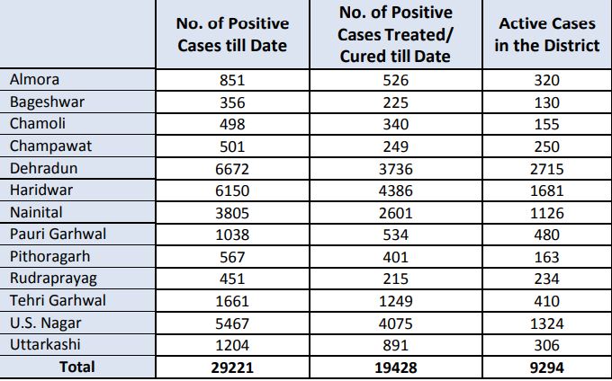 राज्य स्वास्थ्य विभाग द्वारा जारी आंकड़ों के अनुसार, आज देहरादून से 281, उधमसिंह नगर से 271, हरिद्वार में 161, नैनीताल में 110, पौड़ी गढ़वाल में 43, पिथौरागढ़ में 39, टिहरी गढ़वाल में 29, उत्तरकाशी में 17, अल्मोड़ा में 14, चंपावत में 10, चमोली में 08, बागेश्वर में 07 और रुद्रप्रयाग में 05 मामले सामने आएं हैं।