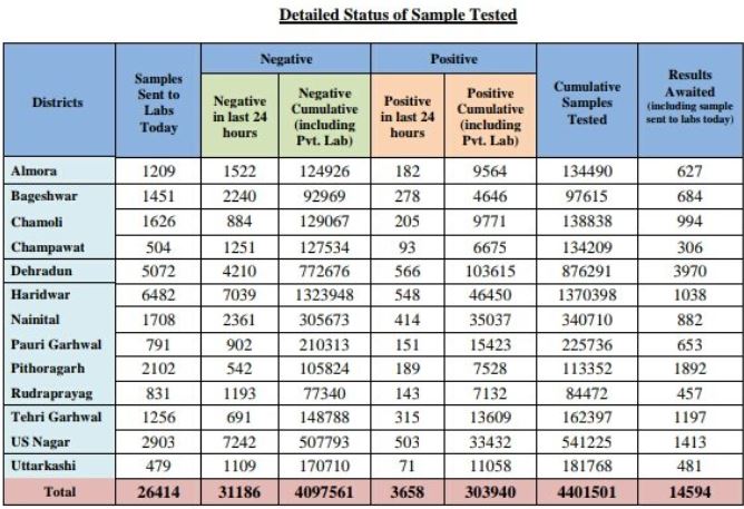 प्रदेश में अब तक कुल 303940 लोग कोरोना से संक्रमित हुए हैं जिसमे से 224535 मरीज स्वस्थ हो गए, 5484 लोगों की मौत हो गई, 5278 मरीजों को इलाज के लिए अन्य प्रदेश को भेजा गया। राज्य की रिकवरी दर 73.87 फीसदी है। पांच दिन पहले तक उत्तराखंड का रिकवरी रेट 68.32 के पास था। देहरादून में नए संक्रमित मरीजों में भारी कमी आई है जिले में 566 नए कोरोना के मामले आये हैं देखिए सभी जिलों की रिपोर्ट-