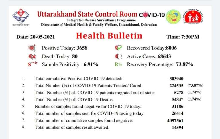 उत्तराखंड में संपूर्ण कोविड कर्फ्यू के दो सप्ताह बाद कोरोना के मामलों में तेजी से कमी आने लगी है वहीं, प्रदेश में रिकवरी रेट में भी जबरदस्त सुधार हो रहा है। उत्तराखंड स्वास्थ्य विभाग द्वारा जारी हेल्थ बुलेटिन के अनुसार, राज्य में पिछले 24 घंटों में रिकॉर्ड तोड़ 8006 लोग ठीक होकर डिस्चार्ज हुए। वहीं नए कोरोना संक्रमण मामलों की संख्या 3658 रही। इस दौरान 80 मरीजों ने कोरोना से जान गंवाईं। बता दें कि उत्तराखंड में एक्टिव मामलों की संख्या कम होकर 68643 रह गई है। जबकि एक बार प्रदेश में कुल एक्टिव मरीजों की संख्या 80 हजार के करीब पहुंच चुकी थी।