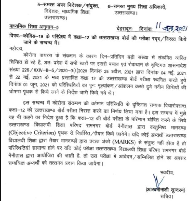 कोरोना संकट के चलते उत्तराखंड सरकार ने कक्षा 12 के लिए उत्तराखंड बोर्ड एग्जाम 2021 को रद्द कर दिया है। राज्य सरकार की ओर से इस बाबत आदेश जारी कर दिया गया है। इससे पहले राज्य बोर्ड 10वीं की परीक्षा भी रद्द कर चुका है।