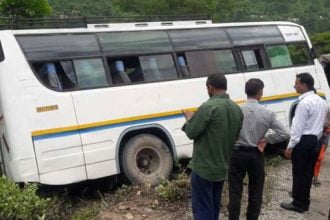 बाइक सवार को बचाने के चक्कर में खाई की और लटक गयी यात्रियों से भरी बस