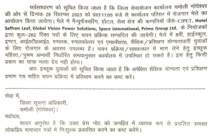 जिला सेवायोजन अधिकारी मुकेश रयाल ने बताया कि 26 सितम्बर,2023 को प्रातः 11 बजे से सेवायोजन कार्यालय गोपेश्वर में रोजगार मेले का आयोजन किया जा रहा है। रोजगार मेले में मैन्यूफैक्चरिंग, होटल तथा सेवा क्षेत्र की कंपनियां होटल सैफ्रून लीफ, ग्लोबल विजन पावर सॉलूशन, स्पेस इंटरनेशनल तथा प्रीमो गु्रप लिमिटेड द्वारा कुल 262 पदों पर भर्ती की जा रही है। जिसके लिए शैक्षिक योग्यता 8वीं, आईटीआई, इण्टर, स्नातक तथा एमबीए है। उन्होंने इच्छुक अभ्यर्थियों से अपेक्षित शैक्षिक योग्यता एवं प्रशिक्षण प्रमाण पत्रों सहित ससमय चयन प्रक्रिया में प्रतिभाग करने की अपील की।