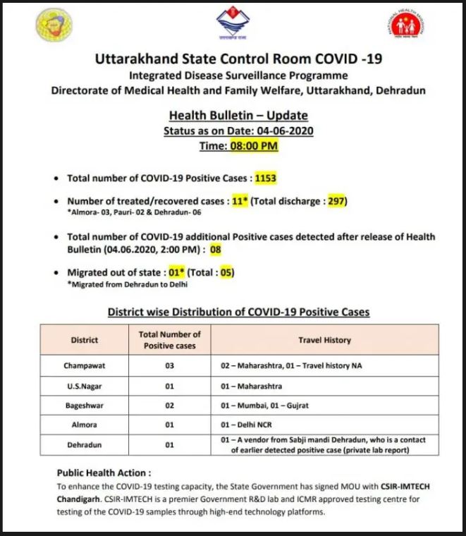 उत्तराखंड में साम को 8 नए कोरोना संक्रमित मिले हैं, इसके साथ ही प्रदेश में कुल संक्रमित मरीजों की संख्या 1153 हो गई है। रात 8:00 बजे जारी स्वास्थ्य विभाग के हेल्थ बुलेटिन के अनुसार, कोरोना पॉजिटिव मरीजों में तीन चंपावत और दो बागेश्वर से हैं। इसके अलावा उत्तरकाशी, अल्मोड़ा और एक उधमसिंह नगर से एक-एक मामले सामने आए है।