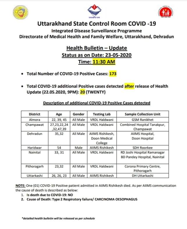 पिथौरागढ़ में भी पहली बार कोरोना मरीज सामने आये हैं। इस तरह से आज कुल 20 मामले सामने आ चुके हैं। इसके साथ ही प्रदेश में कुल संक्रमित मरीजों की संख्या 173 हो गई है। ऋषिकेश एम्स में कैंसर से पीड़ित महिला की मौत पर स्वास्थ्य विभाग ने बताया कि उक्त महिला की मौत कैंसर से हुई है। स्वास्थ्य विभाग ने साफ कर दिया है कि उसकी मौत कोरोना से नहीं हुई है। उक्त मरीज की मौत एसोफैगस कैंसर से हुई है।