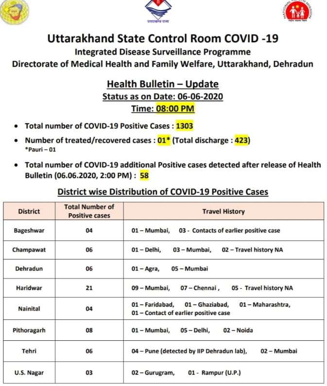 आज साम को प्राप्त बुलेटिन के अनुसार, कुल संक्रमित मरीजों में ज्यादातर मरीजों की ट्रैवल हिस्ट्री मुंबई से है। हरिद्वार में 9 मरीज, देहरादून में पांच मरीज, चंपावत में तीन और अन्य जिलों के 6 मरीजों की ट्रैवल हिस्ट्री मुंबई है।