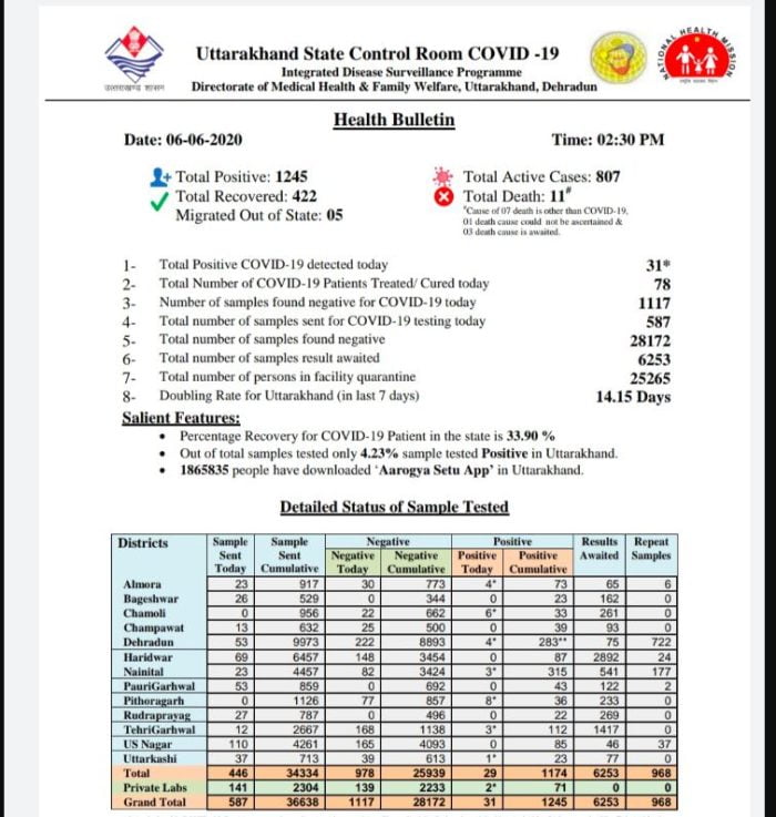 शनिवार दोपहर दो बजे जारी हेल्थ बुलेटिन में उत्तराखंड में 31 नए कोरोना पॉजिटिव मामलों की पुष्टि हुई है। आज पिथौरागढ़ से 8, चमोली से 6, अल्मोड़ा जिले में 4, देहरादून में 4, नैनीताल जिले में 3, टिहरी गढ़वाल में 3 और उत्तरकाशी में 1 मामला सामने आया है। इसके अलावा प्राइवेट लैब में भी 2 कोरोना पॉजिटिव पाए गए हैं। इसके साथ ही प्रदेश में कुल अब कुल कोरोना पॉजिटिव मरीज़ो की संख्या 1245 हो गयी है।