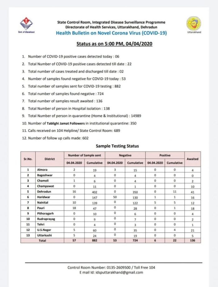उत्तराखंड हेल्थ मिनिस्ट्री द्वारा जारी बुलेटिन के अनुसार, आज कुल 59 लोगों की रिपोर्ट प्राप्त हुई है जिसमे 53 नेगेटिव और 6 पॉजिटिव पाए गए हैं, रूडकी के सिविल अस्पताल में पनियाला गांव का 25 वर्षीय युवक 31 मार्च को राजस्थान के अलवर से लौटा था, पॉजिटिव पाया गया है। हरिद्वार के गैंडीखाता और सुल्तानपुर के जिन जमातियों को मेला अस्पताल के आइसोलेशन वार्ड में रखा गया था, उनकी रिपोर्ट निगेटिव आई हैं। साथ ही उन्हें आइसोलेशन वार्ड से निकालकर कलियर के फेसिलिटी क्वारंटीन में रख दिया है।
