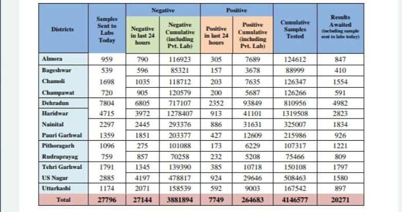 उत्तराखंड में कोरोना वायरस के 7749 नए मामले सामने आए हैं जबकि एक दिन में रिकॉर्ड 7005 मरीज स्वस्थ हुए हैं। प्रदेश में कुल संक्रमित मरीजों की संख्या 264683 पहुँच गई जबकि एक्टिव मामलों की संख्या 77082 पहुंच गई है। आज शाम 6:30 बजे स्वास्थ्य विभाग द्वारा जारी बुलेटिन के अनुसार, प्रदेश में पिछले 24 घंटों में 109 मरीजों ने कोरोना दम तोडा है इस तरह प्रदेश में कोरोना से कुल मौतों का आंकड़ा 4123 पहुंच गया है। आज 27796 नेगेटिव रिपोर्ट्स प्राप्त हुई, प्रदेश में औसत सैंपल पॉजिटिविटी दर बढ़कर 6.38 फीसदी हो गई जबकि वर्तमान में यह दर लगभग 15 फीसदी के आसपास चल रही है।