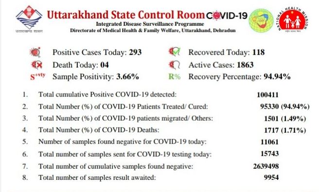 उत्तराखंड में आज कोरोना वायरस 293 नये मामले सामने आये हैं। इसके साथ ही प्रदेश में कुल संक्रमित मरीजों की संख्या 100,411 पहुँच गई है। प्रदेश में कुल एक्टिव मामलों की संख्या 1863 है। आज चार लोगों की कोरोना से मौत हुई है।