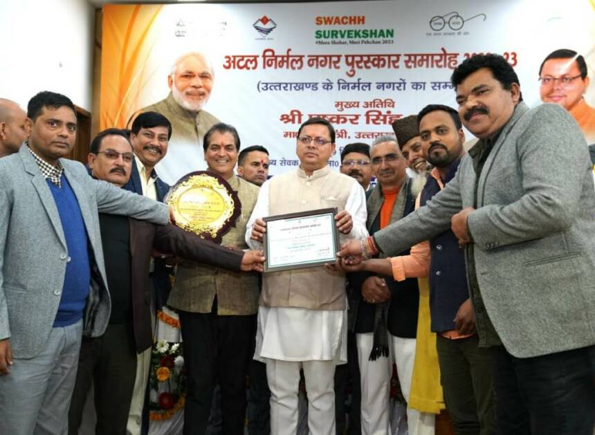 मुख्यमंत्री पुष्कर सिंह धामी ने सोमवार को मुख्यमंत्री आवास स्थित मुख्य सेवक सदन में स्वच्छ सर्वेक्षण-2022 में बेहतर प्रदर्शन करने वाले निर्मल नगरों को अटल निर्मल नगर पुरस्कार 2023 से सम्मानित किया। इस अवसर पर प्रदेश के 09 निकायों को अटल निर्मल पुरस्कार एवं राष्ट्रीय स्तर पर पुरस्कृत 05 निकायों को स्वच्छ गौरव सम्मान प्रदान किया गया। मुख्यमंत्री ने कार्यक्रम के दौरान दून कैंट स्वच्छता चौपाल का लोगो लाँच भी किया।