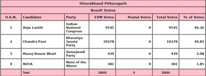 पिथौरागढ़ उप चुनाव की मतगणना जारी है. वोटो की गिनती में दोनों भाजपा और कांग्रेस के प्रत्याशियों के बीच में कांटे की टक्कर देखने को मिल रही है. तीसरे राउंड में कांग्रेस प्रयाशी अंजू लुंठी आगे निकल गई गई थी लेकिन फिर अब चार और पांच राउंड की गिनती के बाद बीजेपी प्रयाशी चंद्रा पंत काफी आगे निकल गई हैं. ताजा अपडेट के अनुसार 25628 वोटों की गिनती हो चुकी है. कांग्रेस को 11751 वोट जबकि बीजेपी को 12948 वोट मिलें हैं. अब दोनों के बीच 1197 वोट का अंतर है. समाजवादी पार्टी को 472 और 457 वोट नोटा के पड़े हैं.