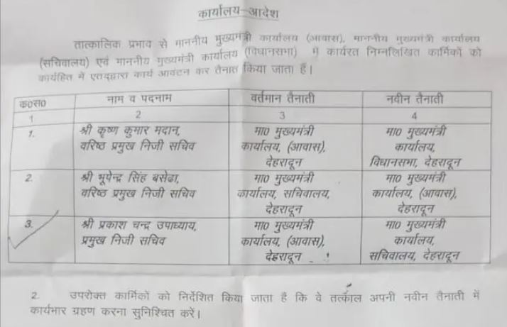 मुख्यमंत्री पुष्कर सिंह धामी के दोबारा शपथ ग्रहण समारोह के बाद अब वरिष्ठ प्रमुख निजी सचिव कृष्ण कुमार मदान को मुख्यमंत्री कार्यालय विधानसभा देहरादून की जिम्मेदारी दी गई है जबकि पूर्व में उनकी तैनाती मुख्यमंत्री कार्यालय आवास की थी वही वरिष्ठ प्रमुख निजी सचिव भूपेंद्र सिंह बसेड़ा को मुख्यमंत्री कार्यालय सचिवालय से नई तैनाती मुख्यमंत्री कार्यालय आवास देहरादून की दी गई है इसके अलावा प्रमुख निजी सचिव प्रकाश चंद्र उपाध्याय को मुख्यमंत्री कार्यालय आवास से मुख्यमंत्री कार्यालय सचिवालय देहरादून की जिम्मेदारी दी गई है।