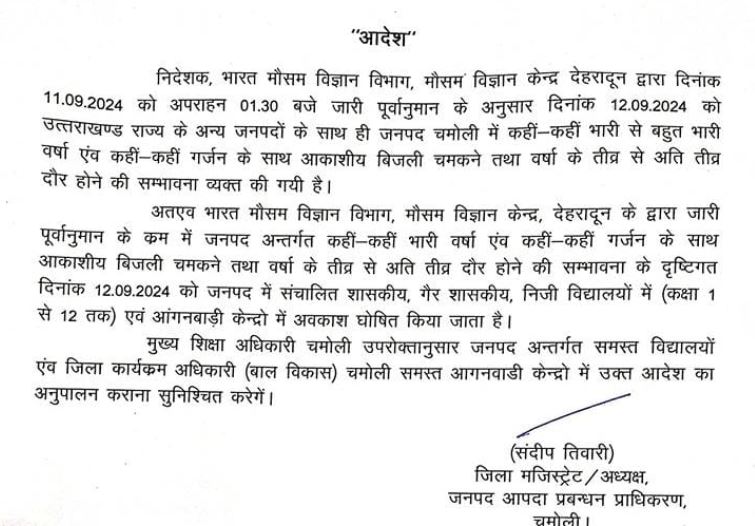 विभाग के अनुसार, मानसून विदा होने से पहले अपने तेवर दिखाएगा। 12 से 14 सितंबर तक प्रदेश की पर्वतीय जिलों में भारी से भारी बारिश होगी। मौसम विज्ञानियों ने हिदायत दी है कि इन दिनों संवेदनशील क्षेत्रों में सतर्कता बरती जाए। इसी चेतावनी को देखते हुए चमोली के जिलाधिकारी संदीप तिवारी ने कल यानी 12 सितम्बर को सभी शासकीय, गैर शासकीय, निजी विद्यालयों में कक्षा-1 से 12 तक एवं आंगनबाड़ी केद्रों में अवकाश घोषित किया है।