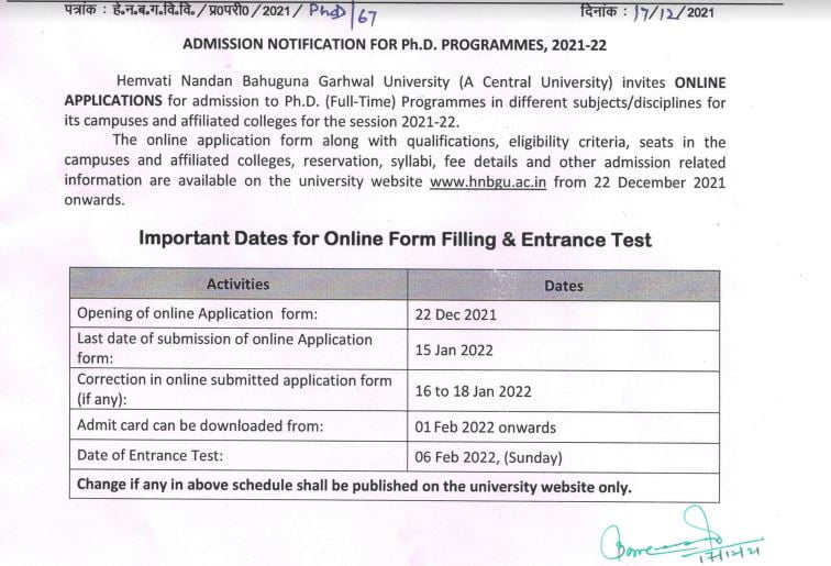 एचएनबीजी विश्वविद्यालय पीएच0डी0 प्रवेश परीक्षा के विषय में नोटिफिकेशन जारी, देखिये