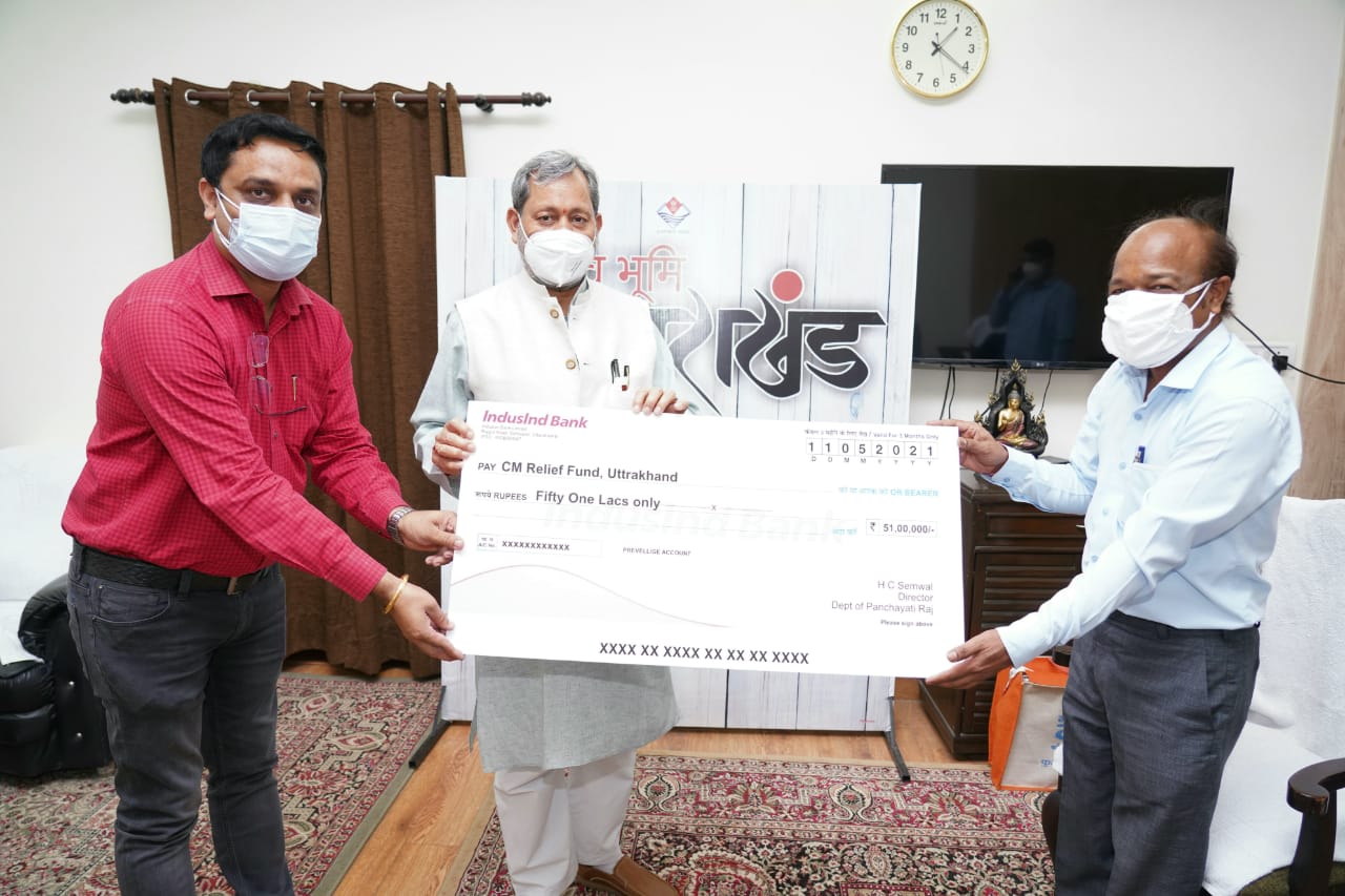 सचिव पंचायती राज हरीश चंद्र सेमवाल ने बताया कि मुख्यमंत्री राहत कोष हेतु प्रदेश की सभी 13 जिला पंचायतों ने अपनी निधि से एक करोड़ रुपए की धनराशि एवं पंचायती राज विभाग के अधिकारियों कर्मचारियों ने अपने वेतन से 51 लाख यानी कि कुल एक करोड़ 51 लाख रुपए मुख्यमंत्री राहत कोष के लिए सौंपे गए।