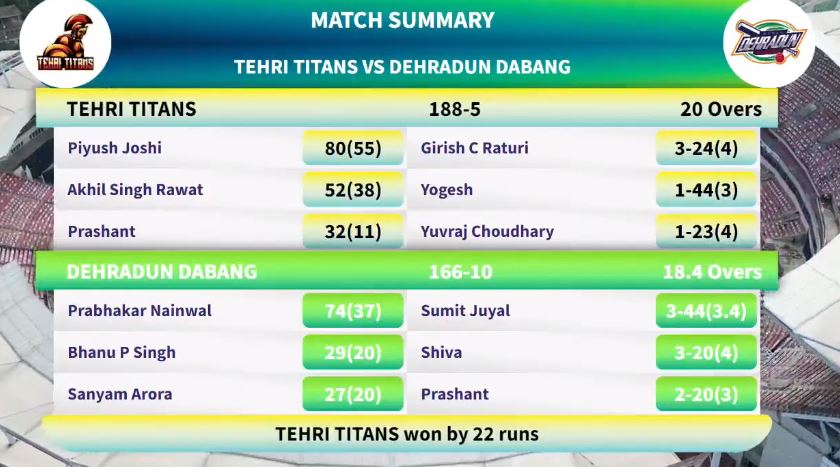 देहरादून दबंग ने आज टॉस जीतकर टिहरी टाइटंस को पहले बेटिंग के लिए आमंत्रित किया। टिहरी टाइटंस ने निर्धारित 20 ओवर में पांच विकेट खोकर 188 रनों का विशाल स्कोर खड़ा किया। पियूष जोशी ने सबसे अधिक 80 रन अपनी टीम के लिए बनाए। अखिल रावत ने 52 रनों की पारी खेली वहीं, अपने लगातार दो छक्कों से टिहरी टाइटंस को सेमीफाइनल में पहुंचाने वाले खिलाड़ी प्रशांत भाटी ने एक बार फिर शानदार पारी खेली। उन्होंने एक ओवर में लगातार चार छक्के भी लगाए। वो 11 गेंदों में 32 रन बनाकर नाबाद लौटे। देहरादून दबंग की ओर से गिरीश रतूड़ी ने सबसे अधिक तीन विकेट लिए।