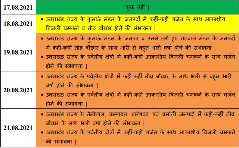 देहरादून : मौसम विभाग ने उत्तराखंड के गढ़वाल और कुमाऊं मंडल में 19, 20 और 21 अगस्त के लिए भारी बारिश का ऑरेंज अलर्ट जारी किया है। मौसम विभाग ने राज्य में अगले कुछ दिनों तक भारी बारिश होने का अनुमान लगाया है। मौसम विभाग के अनुसार, 18 को कुमाऊं क्षेत्र में कहीं कहीं भारी बारिश व तीव्र बौछार पड़ सकती हैं। इसके लिए मौसम विभाग ने येल्लो अलर्ट जारी किया है।