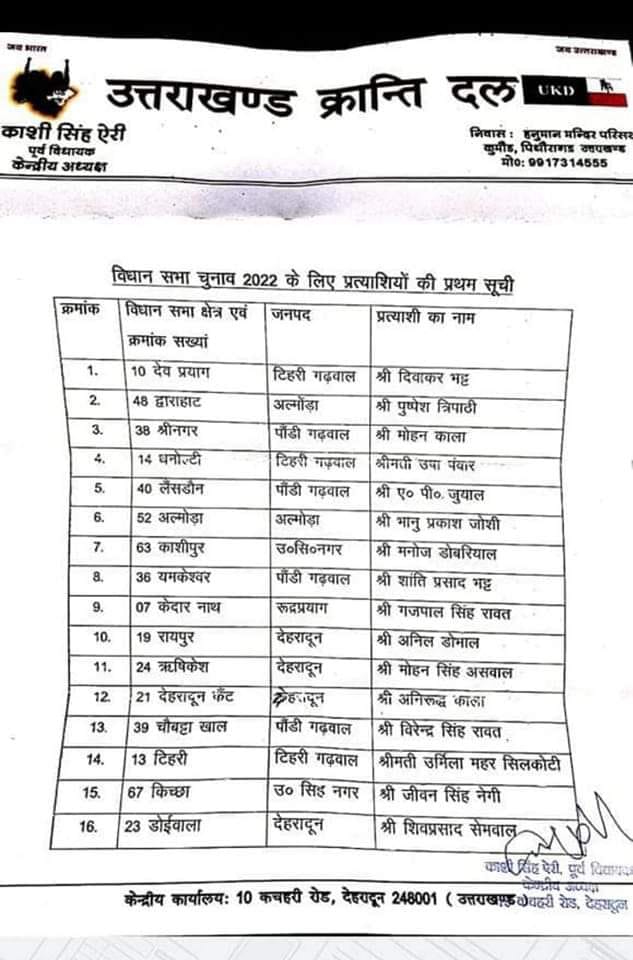 उत्तराखंड में 2022 चुनाव के लिए विभिन्न पार्टियों द्वारा प्रत्याशियों की सूची जारी की जा रही है। उत्तराखंड की सबसे बड़ी क्षेत्रीय पार्टी उत्तराखंड क्रांति दल ने अपने 16 प्रत्याशियों की पहली सूची जारी कर दी है। उत्तराखंड क्रांति दल के केंद्रीय अध्यक्ष काशी सिंह ऐरी ने बताया कि उनकी पार्टी का चुनावी एजेंडा मुख्य रूप से पलायन, बेरोजगारी, भू कानून जैसे विषयों पर है, जिन्हें लेकर व जनता के बीच पहुंचेंगे।