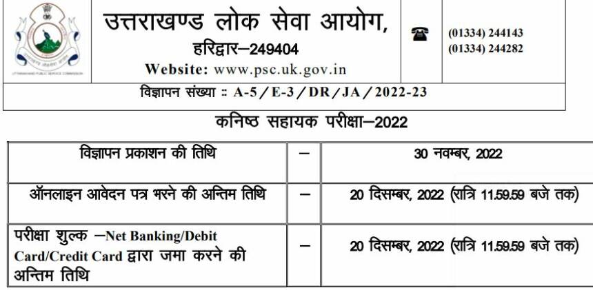 उत्तराखंड के बेरोजगार युवाओं के लिए बड़ी खुशखबरी है। उत्तराखंड लोक सेवा आयोग (UKPSC) ने समूह-ग भर्ती के तहत 71 विभागों में कनिष्ठ सहायक के 445 पदों के लिए विज्ञापन जारी किया है। इन पदों के लिए 20 दिसंबर तक ऑनलाइन आवेदन कर सकते हैं। इच्छुक अभ्यर्थी आवेदन करने के लिए आयोग की वेबसाइट https://psc.uk.gov.in/ पर जाकर अभी से सीधे आवेदन कर सकते हैं।