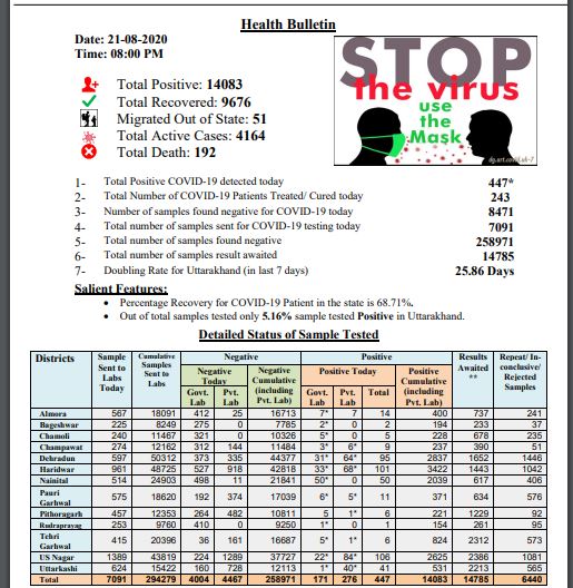 उत्तराखंड में कोरोना के के मामले तेजी से बढ़ रहे हैं। आज उत्तराखंड में कोरोना संक्रमण के 447 नए मामलों की पुष्टि हुई है। उत्तराखंड स्वास्थ्य विभाग द्वारा जारी आंकड़ों के अनुसार, प्रदेश में अब कुल मामले बढ़कर 14,083 हो गये हैं।