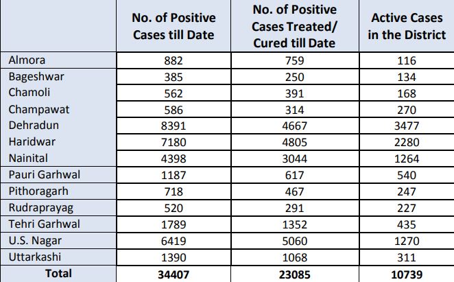 1,391 new #COVID19 cases detected in Uttarakhand today. Total positive cases in the state are now 34,407 including 10,739 active cases and 23,085 recovered cases: State Health Department pic.twitter.com/l6mwz140cN