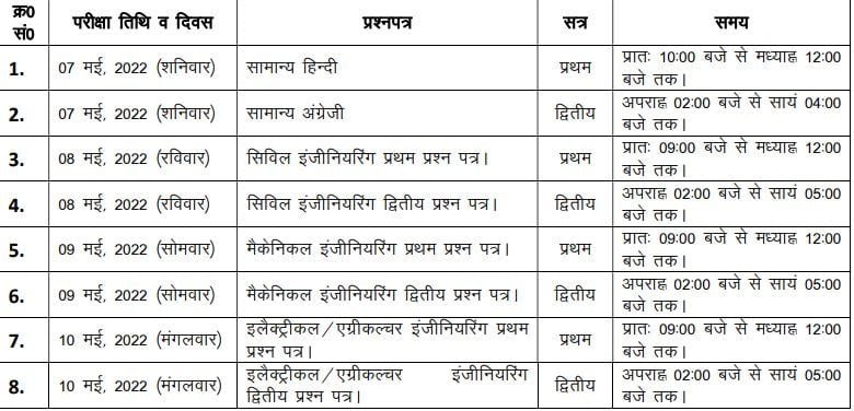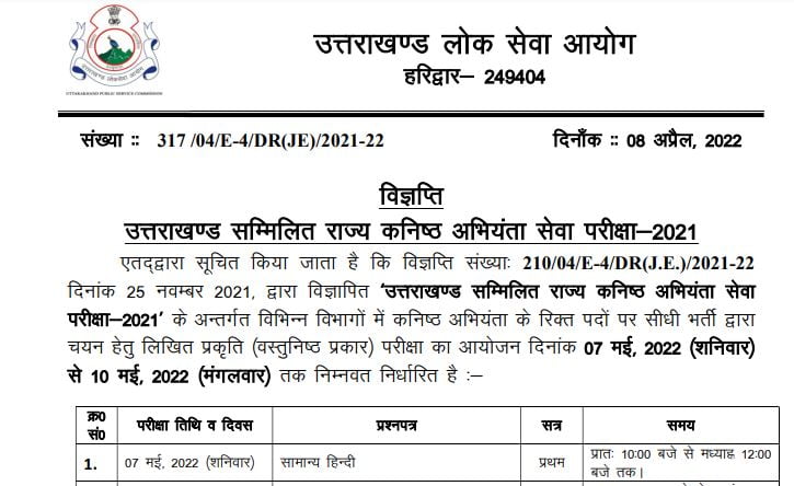 उत्तराखंड लोक सेवा आयोग ने उत्तराखण्ड सम्मिलित राज्य कनिष्ठ अभियंता सेवा परीक्षा-2021 के लिए लिखित परीक्षा की तिथियां घोषित कर दी हैं। यह परीक्षा 07 मई 2022 से 10 मई 2022 तक आयोजित की जा रही हैं बता दें कि आयोग ने 25 नवंबर 2021 को उत्तराखंड में जूनियर इंजीनियरों के पदों पर बंपर भर्तियां निकली थी। 17 दिसंबर 2021 तक आवेदन हुए थे जिसमें जूनियर इंजीनियर के कुल 776 रिक्त पदों पर भर्तियों के लिए आवेदन मांगे गए थे।