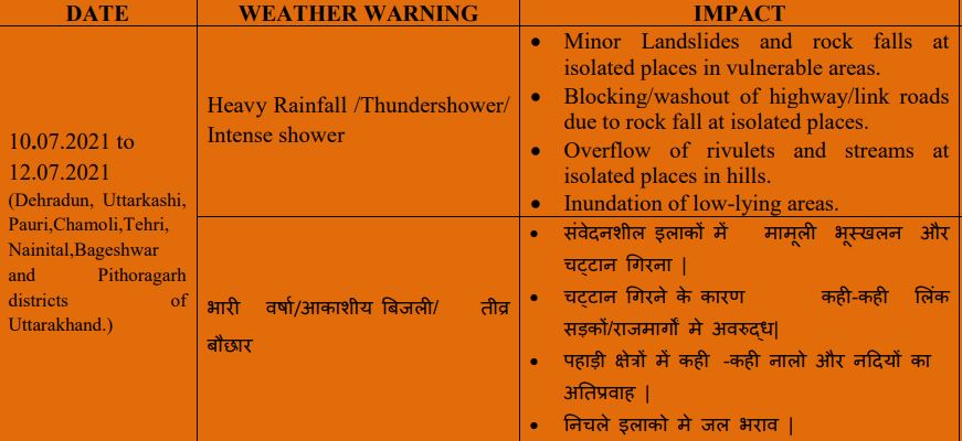 मौसम विभाग ने 11 जुलाई को देहरादून, उत्तरकाशी, टिहरी, चमोली, नैनीताल, पिथौरागढ़ और बागेश्वर जिलों के लिए भारी बारिश का अलर्ट जारी किया गया है इस दौरान हरिद्वार, चम्पावत और पौड़ी जनपद में कहीं-कहीं आकाशीय बिजली के साथ भारी बारिश का अनुमान है। वहीं 12 जुलाई को देहरादून, पौड़ी, उत्तरकाशी, टिहरी, चमोली, नैनीताल, पिथौरागढ़ और बागेश्वर जनपदों में भारी से भारी बारिश हो सकती है। मौसम विज्ञान ने 11 जुलाई और 12 जुलाई को भी बारिश का ऑरेंज अलर्ट जारी किया है।