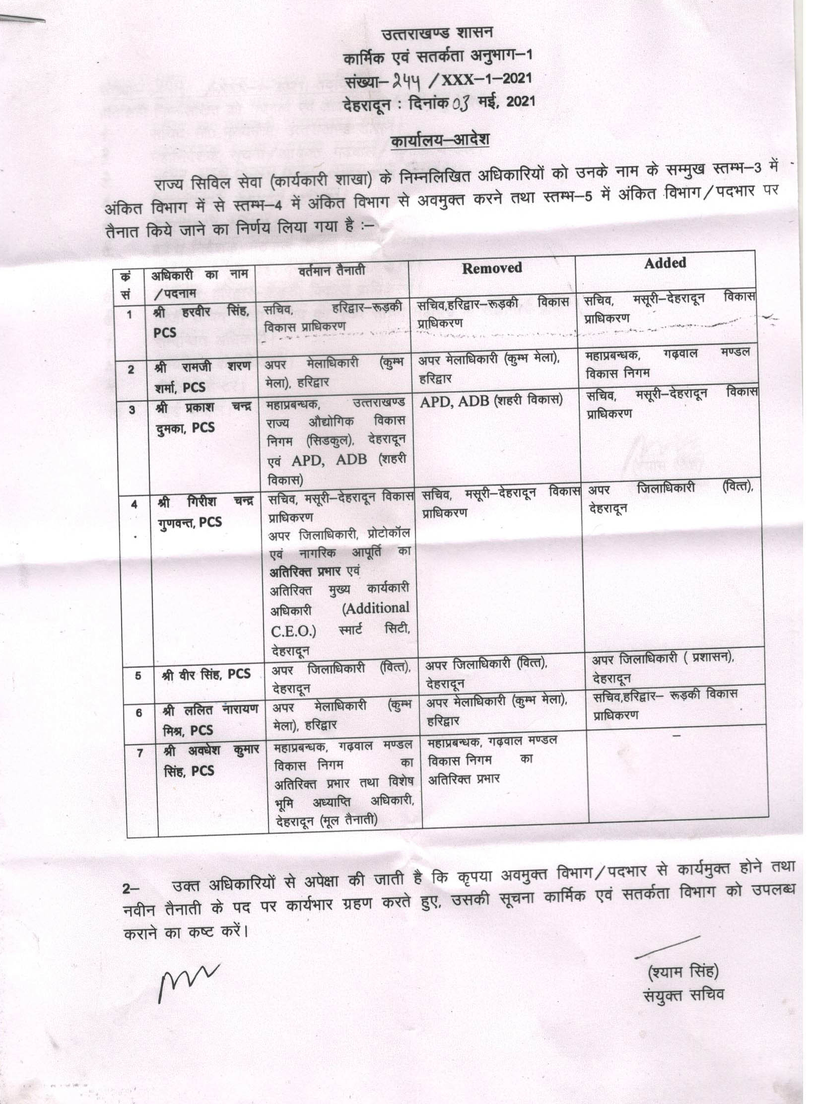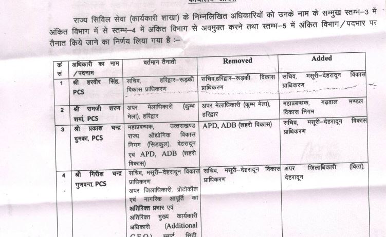 इसके अलावा सचिव मसूरी-देहरादून विकास प्राधिकरण श्री गिरीश चंद्र गुणवन्त को अपर जिलाधिकारी (वित्त) देहरादून की नई जिम्मेदारी सौंपी गई है। जबकि अपर जिलाधिकारी (वित्त) देहरादून की जिम्मेदारी संभाल रहे पीसीएस श्री वीर सिंह को अब अपर जिलाधिकारी (प्रशासन ) देहरादून बनाया गया है। पीसीएस श्री ललित नारायण मिश्र को अपर मेलाधिकारी(हरिद्वार कुम्भ) की जिम्मेदारी से मुक्त करते हुए सचिव हरिद्वार-रुड़की विकास प्राधिकरण बनाया गया है। जबकि पीसीएस अवधेश कुमार सिंह को महाप्रबन्धक गढ़वाल मंडल विकास निगम के अतिरिक्त भारा से मुक्त किया गया है, उन्हें कोई नई जिम्मेदारी नहीं सौंपी गई है वर्तमान में वे महाप्रबन्धक गढ़वाल मंडल विकास निगम के अलावा विशेष भूमि अध्याप्ति अधिकारी देहरादून का पदभार संभाल रहे थे।