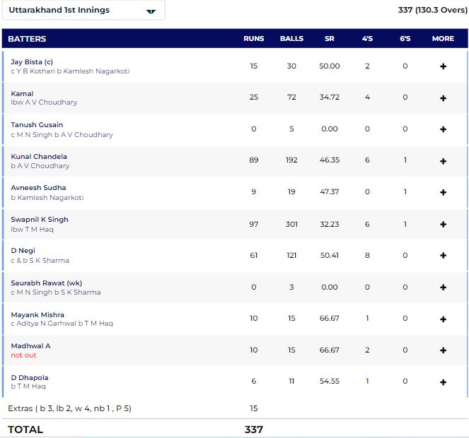 कुणाल शतक बनाने के शानदार मौके को चूक गए लेकिन तब तक वे उत्तराखंड को संकट से बाहर निकाल चुके थे। पहले दिन के खेल समाप्ति के समय उत्तराखंड का स्कोर पांच विकेट के नुकसान पर 228 रन था। आज स्वप्निल सिंह ओर दिक्षांशु नेगी ने पारी को आगे बढ़ाते हुए 300 के पार पहुंचाया। दीक्षाँशु नेगी 61 रन बनाकर आउट हुए इसके बाद स्वप्निल सिंह भी 97 रनों के व्यक्तिगत स्कोर पर आउट हो गए। इस तरह उत्तराखंड की टीम 337 रनों का स्कोर खड़ा करने में कामयाब रही। राजस्थान की ओर से अनिकेत चौधरी ने तीन विकेट, तनवीर उलहक ने तीन विकेट, कमलेश नगरकोटी ने दो विकेट जबकि शुभम शर्मा ने भी दो विकट लिए।