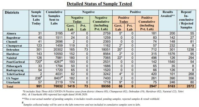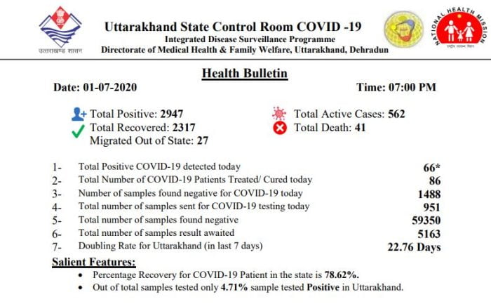 रिपोर्ट के अनुसार, प्रदेश में कोरोना का रिकवरी रेट 78 प्रतिशत से अधिक तो डबलिंग रेट 45 दिन हो गया है। बुधवार को 1415 सैंपल की रिपोर्ट नेगेटिव आई है, अभी भी 5163 सैंपल की रिपोर्ट आनी बाकी है। बुधवार को 951 नए सैंपल्स जांच के लिए भेजे गए हैं।