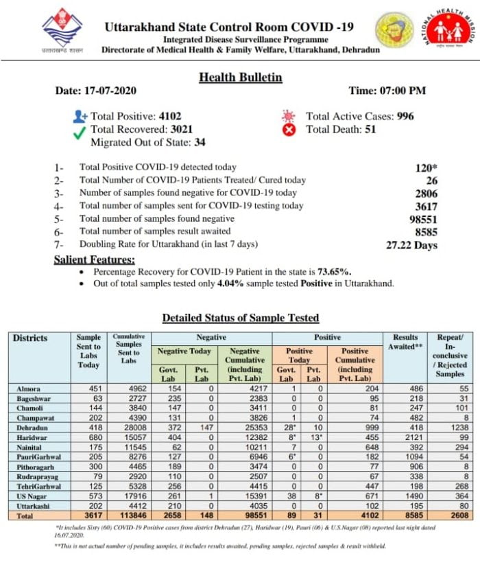 राज्य नियंत्रण कक्ष कोविड-19 द्वारा जारी किए गए हेल्थ बुलेटिन के अनुसार, आज 2806 सैंपल्स की रिपोर्ट नेगेटिव प्राप्त हुई है और पूरे प्रदेश से 3617 सैंपल्स जांच के लिए भेजे गए। राज्य में अभी भी कुल 8585 सैंपल्स की रिपोर्ट आनी बाकी है। कोरोना से राज्य में एक मौत हुई है। आज उधमसिंह नगर जिले में एक 55 वर्षीय महिला की कोरोना से मौत हुई है। राज्य में कोरोना से मौत का आंकड़ा 51 पहुंच गया है।