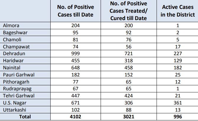उत्तराखंड में कोरोना का कहर तेजी से बढ़ता जा रहा है शुक्रवार को राज्य में एक बार फिर 120 नए कोरोना संक्रमित मरीज मिले हैं। राज्य में कुल संक्रमित मरीजों की संख्या 4102 पहुँच गई। 26 मरीज स्वस्थ होकर घरों को लौटे, जिसके बाद प्रदेश में ठीक होने वाले मरीजों की संख्या 3021 हो गई राज्य में 996 एक्टिव केस हैं।