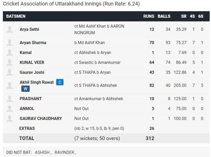 देहरादून: वीनू माकंड ट्रॉफी के महत्वपूर्ण लीग मुकाबले में उत्तराखंड ने मेघायल की 165 रनों से हरा दिया है। आज मेघायल टॉस जीतकर पहले फील्डिंग करने का फैसला लिया। उत्तराखंड के बल्लेबाजों ने गेंदबाजों ने जमकर क्लास ली। आर्यन शर्मा ने 70, कुणाल वीर ने 64 व कप्तान अजीत सिंह ने ताबड़तोड़ 82 रनों की पारी खेली। उत्तराखंड ने निर्धारित 50 ओवर में सात विकेट के नुकसान पर 312 रन बनाये और एक विशाल लक्ष्य मेघायल के सामने रखा। इसके जवाब में मेघायल की पूरी टीम 41.5 ओवर में 147 रन बनाकर ढेर हो गई।