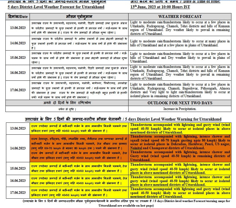 मौसम विभाग द्वारा बताया गया है कि 14 जून को देहरादून, हरिद्वार, पौड़ी, उधमसिंह नगर, नैनीताल तथा चम्पावत जनपदों में कहीं-कहीं गर्जन के साथ आकाशीय बिजली चमकने, तीव्र बौछार तथा झक्कड़ (वायु गति 60-70 kmph से बढ़कर 80 kmph तक ) चलने की संभावना है। राज्य शेष जनपदों में कहीं-कहीं गर्जन के साथ आकाशीय बिजली चमकने, तीव्र बौछार तथा झोंकेदार हवाएं (वायु गति 40-50 kmph) चलने की संभावना है ।