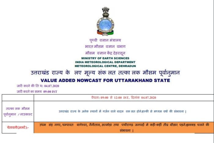 मौसम विभाग ने उत्तराखंड के छह जिलों के लिए बारिश की चेतावनी जारी की है। मौसम विभाग के अनुसार विशेषकर कुमाऊं क्षेत्र के उधमसिंह नगर, चंपावत, बागेश्वर, अल्मोड़ा, नैनीताल और पिथौरागढ़ में भारी बारिश की संभावना है। प्रदेश के अन्य इलाकों में भी गरज-चमक के साथ बारिश हो सकती है।